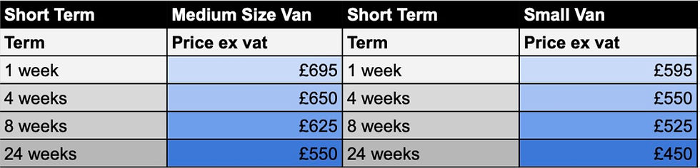 Hire costs can vary depending on the term of which you have agreed and the type of vehicle you choose. Here are some examples of the costs you could typically expect to pay.